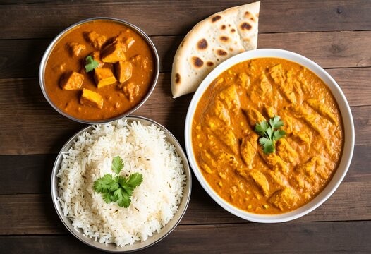 Assortment of Indian dishes like curries and rice served with flatbread. Aromatic spices and fresh herbs garnish the vibrant meal. Delicious traditional cuisine for lunch or dinner.