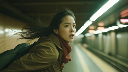 Scared woman running in subway station, close up