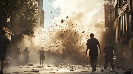 The chaotic city streets with collapsed buildings, cracks splitting the asphalt, and panicked residents running around background wallpaper AI generated image