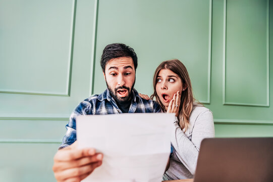 Stressed young couple checking bills, taxes and bank account balance at home  - Family at panicking debt and cost of living