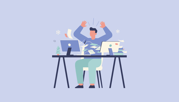 Stressed office worker panicking over heavy workload during the winter holidays