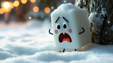 Animated sugar cube character panicking in snowy scene