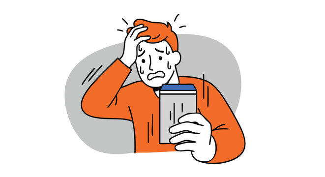 Stressed man panicking over mobile phone notification, feeling overwhelmed by digital overload
