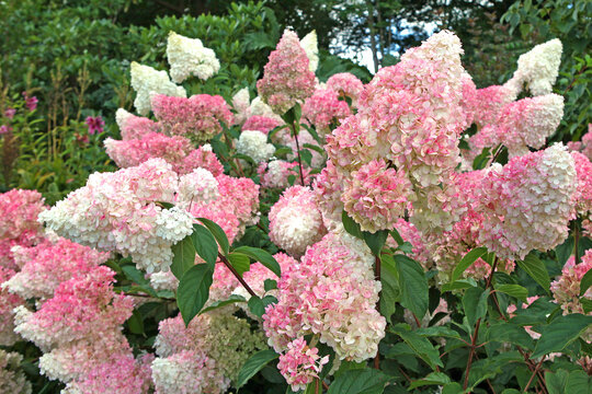 Pink and white Panicle Hydrangea, Vanille Fraise 'Renhy' in flower.