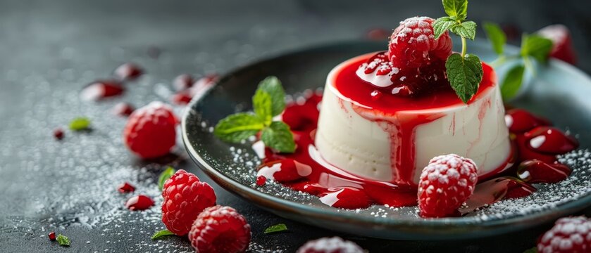 Panna cotta with berry sauce, raspberries and fresh mint.