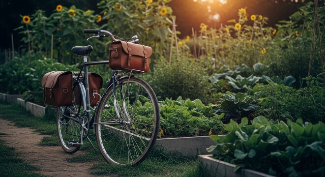 Vintage Bicycle with Pannier Bags Parked by Urban Community Garden