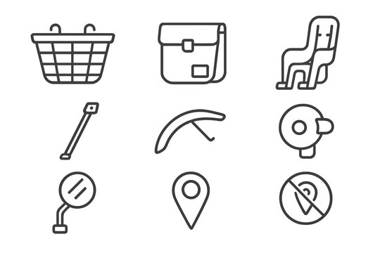 Bicycle Accessories Icons. Line style icons of Bicycle accessories: basket, pannier bag, child seat, kickstand, mudguard, bell,