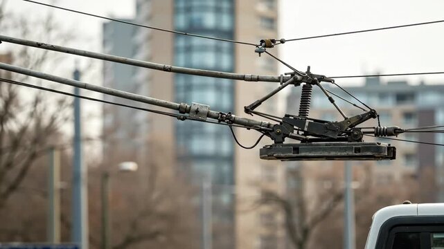 Close-up of a trolleybus pantograph on an overhead power line. Electric tram mechanism drawing current from a catenary system. Urban public transportation infrastructure