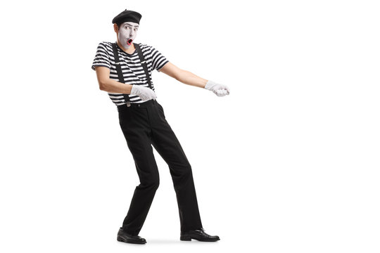 Mime pretending to pull a rope