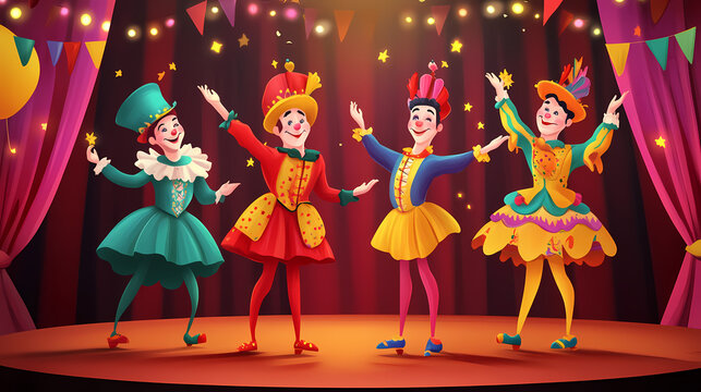 Traditional british pantomime actors on stage in theater wearing colorful costumes they are performing and singing and wear makeup english theater concept. Traditional Costume. Illustration