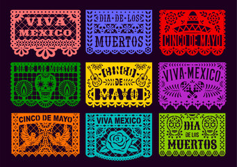 Mexican papel picado paper cut holiday flags. Cinco de mayo, day of the dead, viva Mexico. Vector traditional laser cutting decoration banners with floral pattern, skulls, cacti, flowers or sombrero