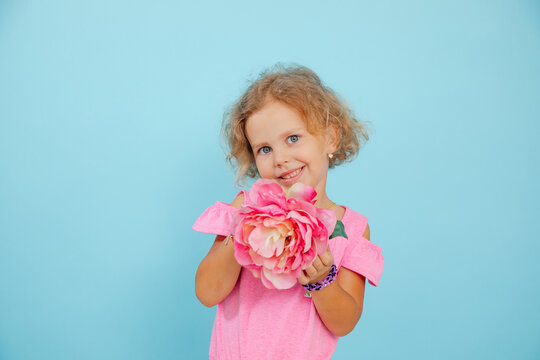 Charming little girl show beautiful floral craft on empty blue background, free copy space. Blue eyed child of kindergarten age hold paper pink flower. Children creativity and fantasy