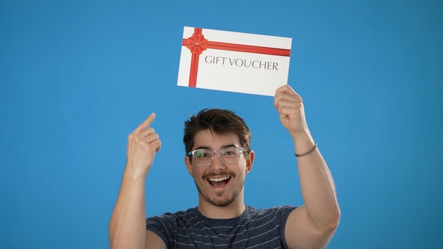 Portrait of smiling happy handsome young man striped t-shirt holding gift certificate voucher coupon isolated on blue background in studio.