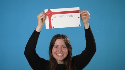 Smiling happy beautiful young woman black t-shirt posing isolated on blue background in studio. People sincere emotions lifestyle concept. Portrait, hold gift certificate coupon