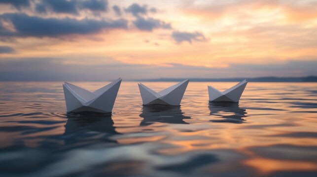 Three paper boats sailing on a lake at sunset with vivid orange skies