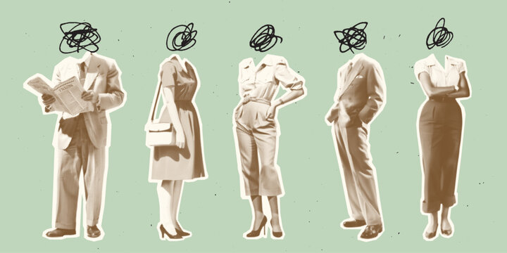 Retro Surreal Collage Set. Trendy halftone clip art elements in a retro-futurism style, includes men and women. Vintage psychedelic dotted texture for poster art or social media. Contemporary concept.