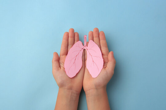 Man holding paper lungs against a neutral backdrop