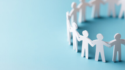 Three white paper people holding hands on blue background with shadow of one person being raised up, representing unity and support in team work or group activities Generative AI