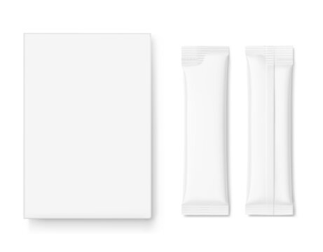 Blank package stick mockup with paperboard box mockup. Flat lay view. Vector illustration isolated on white background. Can be use for food, cosmetic, medicine and etc. EPS10.
