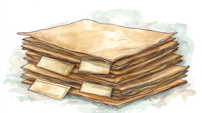 A realistic watercolor illustration of a tall stack of aged old paper documents and files with blank labels and envelopes, detailed and textured vintage paperwork scene