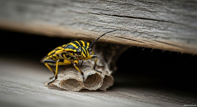 A vibrant yellow and black striped shield bug with long antennae stands on a small, papery wasp nest, captured in a detailed macro view on a weathered wood plank