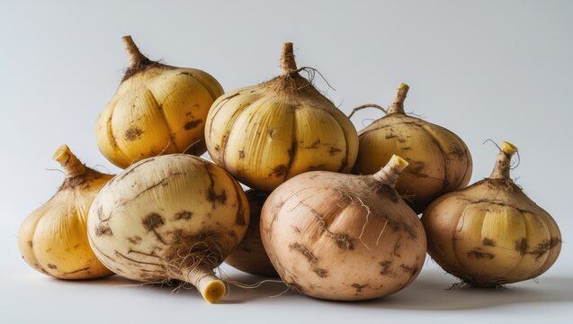 A group of four white onions with papery skin sitting on a plain white surface in a close up shot