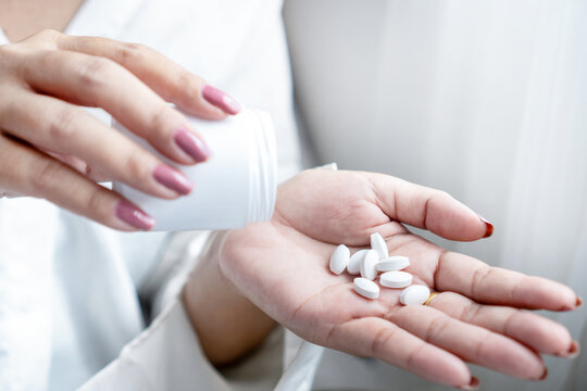 Close-up of a woman’s hand holding a bottle of medicine while taking pills. Concept of overdose risk with paracetamol or painkillers, medication use, and health care awareness