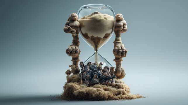 Melting hourglass with sand forming muscular arms, depicting time's paradoxical strength.