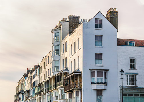Elegant white Victorian terrace houses with ornate balconies and white rendering catching glow of the late afternoon winter sun.