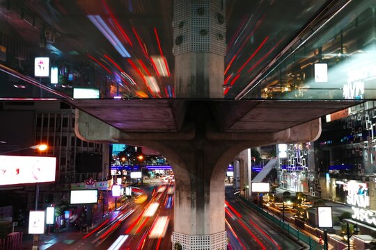 Aerial view of Ploenchit junction with cars traffic skyscraper buildings. Bangkok City in downtown at night, Thailand