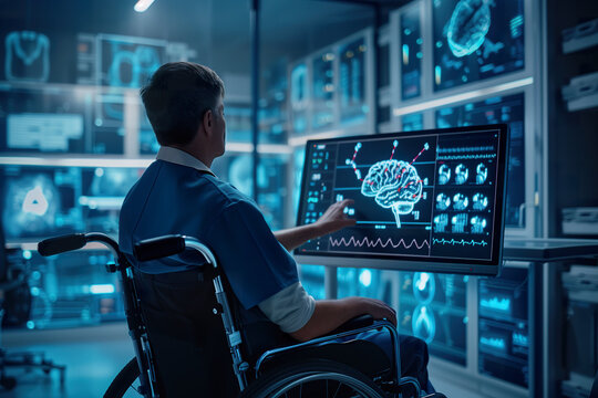A paralytic man in wheelchair gazing at a monitoring screen. Brain computer interface.
