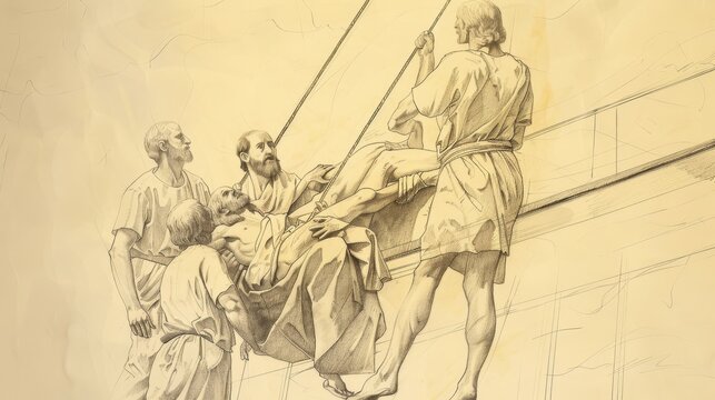 Paralytic Lowered Through Roof to Jesus for Healing, Biblical Illustration, Beige Background, Copyspace