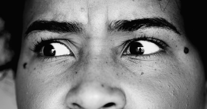 One paranoid worried young black woman macro close-up eyes looking sideways with intense preoccupation and obsession in dramatic black and white monochrome