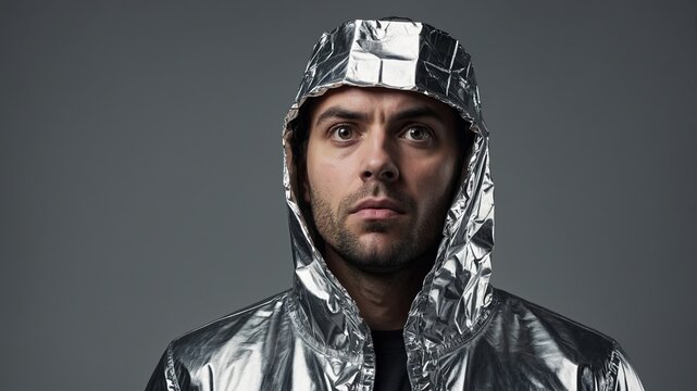 Man in shiny hooded foil suit staring with intense paranoid expression against plain studio background, World UFO Day