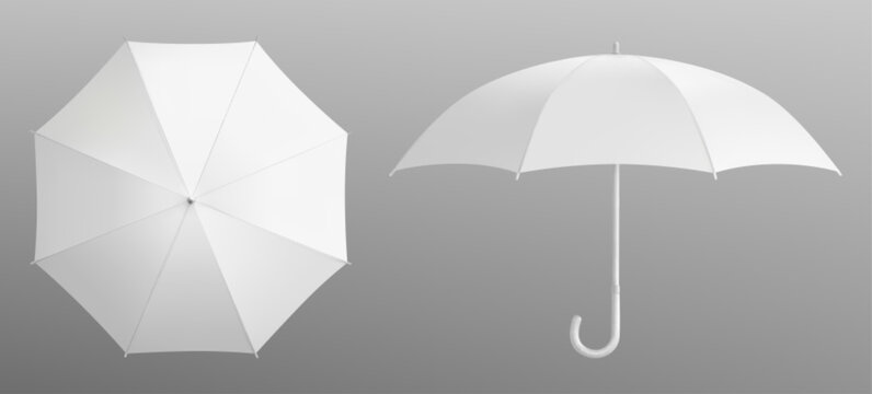 White 3d isolated blank umbrella mockup vector. Realistic parasol with handle mock up for branding and advertising set. Rain weather season fashion. Various waterproof open object front and top view
