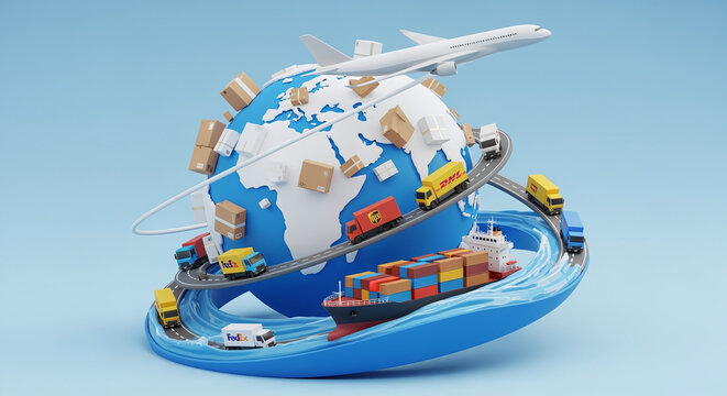 Worldwide logistics and e-commerce concept: A 3D composition featuring a globe covered in parcels, a cargo airplane, a container ship, and delivery trucks. The entire scene is rendered in a clean, sty