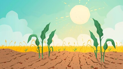 1. Desolate landscape with hard, dry, cracked soil; barren and parched earth stretching into the horizon, with sparse, struggling trees attempting to grow under the harsh, relentless sunlight that