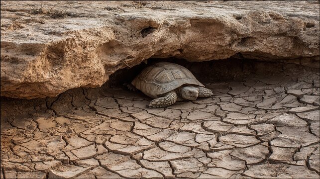 overhang. Cracked parched mud of a dry riverbed, a tortoise shell in shaded sand under an overhang. wildlife magazines, conservation campaigns, designed for wildlife conservation campaigns.