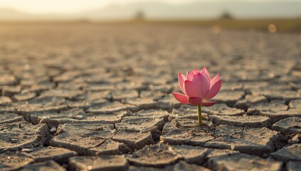 Morning scene of a pink lotus flower on parched earth highlighting drought stress and botanical endurance