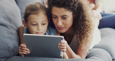 Tablet, mother and child streaming video online, internet and website in a home couch or sofa and bonding together. App, happy and parent search the web with kid on social media in a house lounge