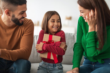 In a warm living room, a Middle Eastern girl beams with joy as she receives a wrapped gift from her smiling parents. They celebrate together, capturing a moment of family happiness and love.