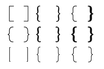 Bracket and brace symbols set. Various styles of curly and square brackets for programming, coding, and design. Vector graphic elements for text formatting and typography.