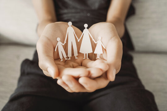 Top view of parents and kid holding empty hands together on beige background, space for text. Family day