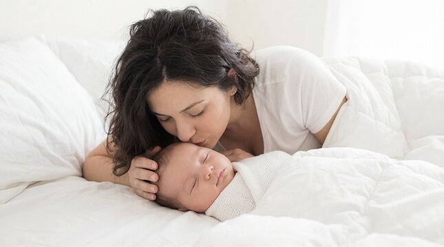 mom and daughter sit in bed having fun, kissing and hugging.