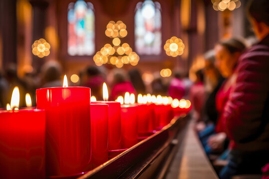 red candles in a church where people attend the Christmas service. AI generated