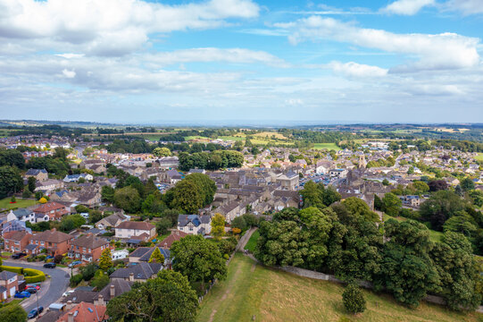 Aerial drone photo of the beautiful town of Leyburn which is a market town and civil parish in North Yorkshire in the UK, showing the houses in the town from above in the summer time