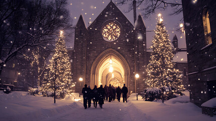 A snowy scene outside a church with parishioners entering for Christmas Eve midnight service.