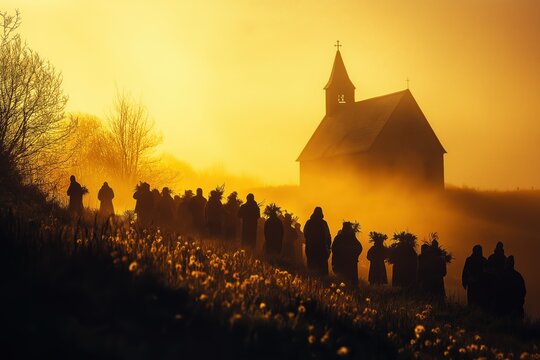 Misty morning light frames church as parishioners gather with fresh spring flowers