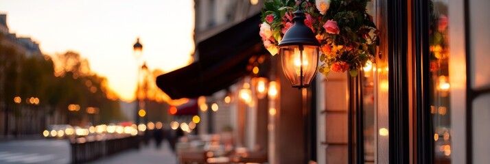 Parisian cafe storefront with red awning, outdoor seating, and plant decorations; evening ambiance, ideal for travel blogs