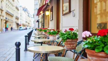 Romantic parisian bistro with sidewalk cafe setting and string lights   blurred outdoor dining scene